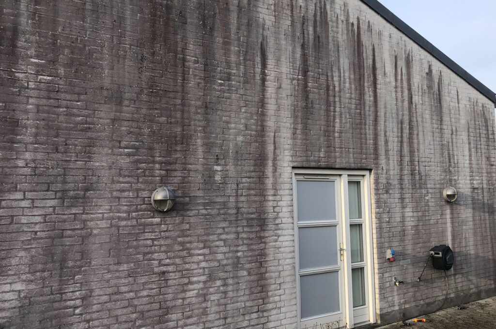 Ved en algebehandling sprøjter vi murværk og facade med kemi som er godkendt af Miljøstyrelsen.